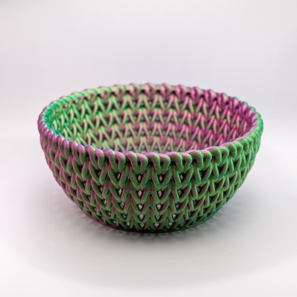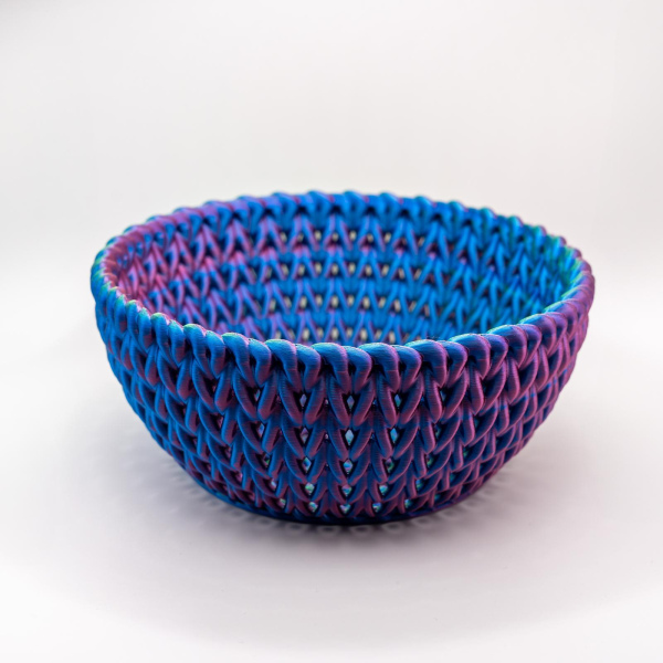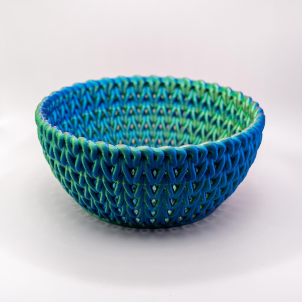 letenka je čudovita 3D-natisnjena dekorativna posoda, ki združuje eleganco pletenega vzorca s sodobno tehnologijo. Njena struktura ustvarja iluzijo ročnega pletenja, medtem ko barvni prehodi v odtenkih modre, roza in zelene poskrbijo za osupljiv vizualni učinek.